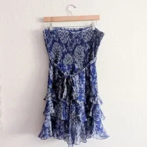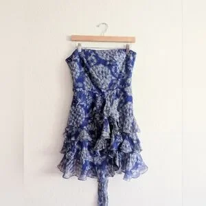 Excellent condition, no flaws. Still has the tag string, just no tags. Beautiful strapless mini dress with a rich blue flouncy silk fabric. Smocking on the back for a perfect fit.