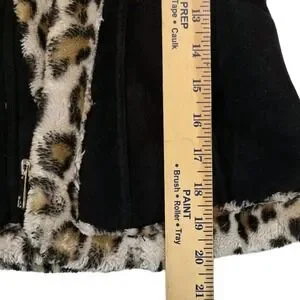 Stylish black jacket with leopard print trim. Features a cozy hood and flared design. Perfect for keeping warm.