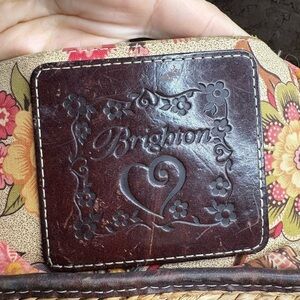An absolutely beautiful shoulder bag mad with raffia and leather accents, and the infamous Brighton heart metal accent. This bag has 2 beautiful woven styles. Trimmed with leather, solid and bottom braided leather shoulder strap (strap non adjustable), leather closure strap. The inside lining has a floral pattern with browns, greens, pinks, blue and yellow. Has one pocket on the inside with the leather Brighton logo label.