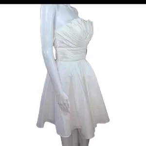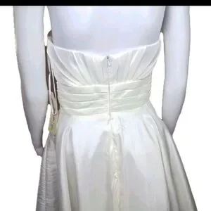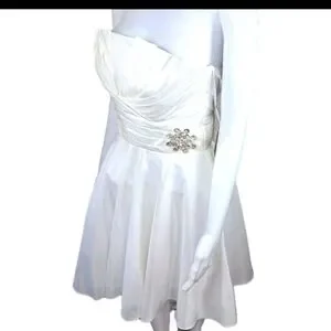 Cinderella strapless white formal dress in size small. It is designed above the knee and features a classic white color, with rhinestone accents. perfect for formal occasions such as weddings, graduation, prom, and photos.