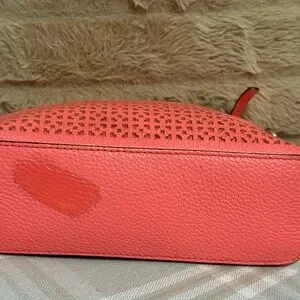 Add a pop of color to your outfit with this authentic Kate Spade New York "Bay Street Sandra" crossbody bag! This stylish piece features a vibrant coral pink pebbled leather with a chic laser-cut perforated design along the bottom.