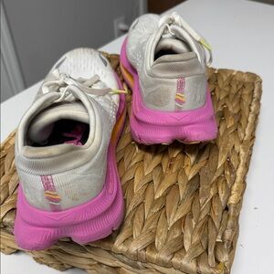 Hoka athletic shoes with a cream upper and vibrant pink sole. Designed for comfort and performance.