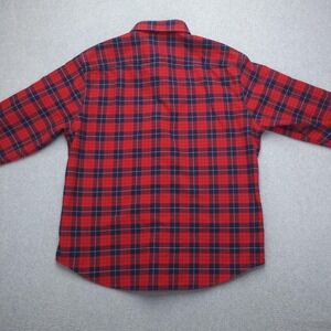 Back details: Straight back yoke with matching plaid pattern and clean back panel for a classic flannel shirt silhouette.