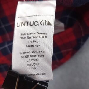 Label details: Woven UNTUCKit neck label reading Large 100% Cotton Made in Mauritius Est. 2011, plus inner tag listing Style Name Daumas, Style Number 40336, regular fit, color NAV, and season 2019 FA 2.