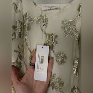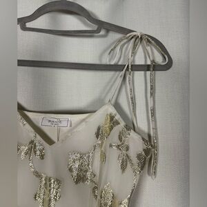 Brand New With Tags. Sage The Label from Sadie & Sage Afterglow Lurex Metallic Midi Dress in White Champagne. White base with metallic champagne gold floral print. Adjustable tie spaghetti straps. Midi length with slit. Hidden zipper close in the side. Size Small.