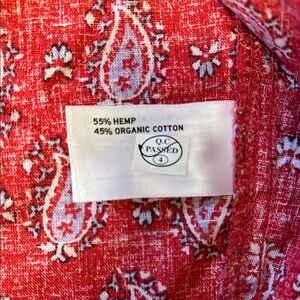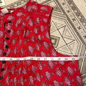 Vibrant red sleeveless blouse with paisley print. Sleeveless and button-up style. Perfect for casual outings. Chest measurement is 21.5”