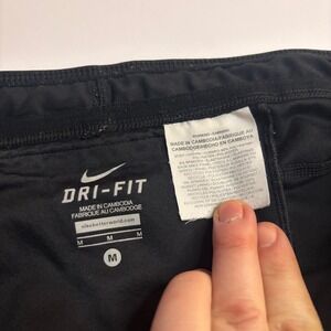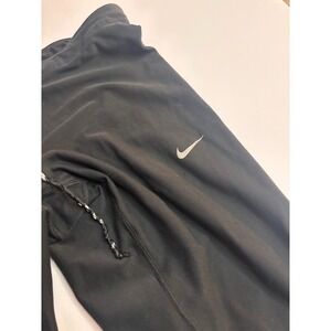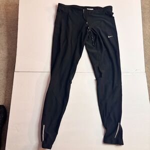 Nike Dri-FIT running tights provide high-performance comfort with moisture-wicking fabric and strategic ventilation. These athletic leggings feature mesh panels behind the knees for enhanced breathability during intense workouts. The design includes a secure drawstring waistband, a back zippered pocket for small essentials, and ankle zippers for easy on-and-off over footwear. Reflective details on the lower legs and the iconic silver Swoosh logo ensure visibility in low-light conditions.