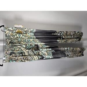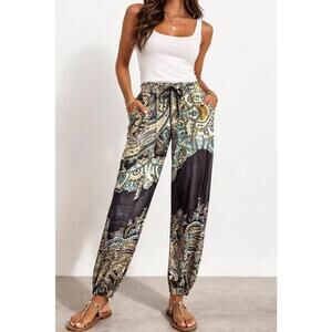 New with tags, these women's jogger pants feature a boho paisley print in a mix of black, turquoise, cream, and gold tones. The elastic waistband with drawstring ensures a comfortable, adjustable fit. The relaxed fit tapers at the ankle with elastic cuffs, perfect for casual or lounge wear. Made with soft, lightweight fabric, these pants offer both style and comfort for everyday wear.
