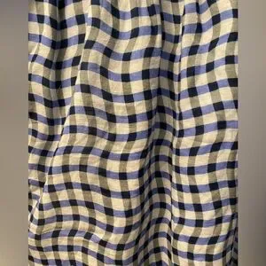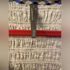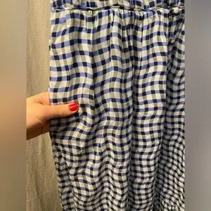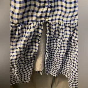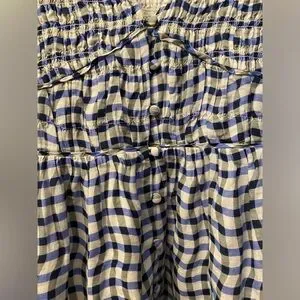 Anthropologie- Peregrine Blue and White Gingham Dress featuring v-neck, smocked bodice, flutter sleeves, button down details and pockets! Cute spring/summer dress with a wavy checkered pattern. Features a sleeveless design and a flowing silhouette. Lightweight and breathable fabric. 100% cotton dress; lined. Top has stretch! Front slit where buttons end. Super flattering fit.