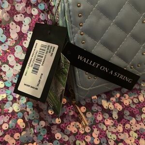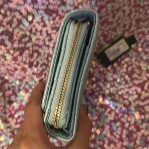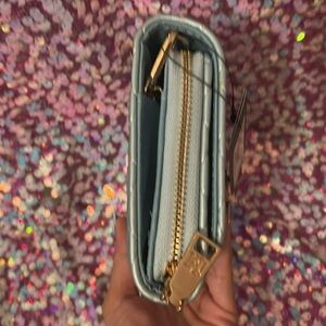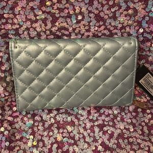 Elegant silver quilted wallet with gold accents. Features a stylish logo and studded details. This bag is so cute it’s a light blue bag has a nice shiny look to the material . It’s pretty cool it has a wallet inside the bag . Brand new with tags. The zipper on this bag sometimes has trouble zipping I think it has to do with one of the teeth .