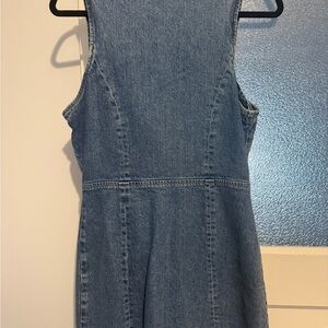 Chic denim mini dress with button-front. Sleeveless design. Ideal for casual wear.