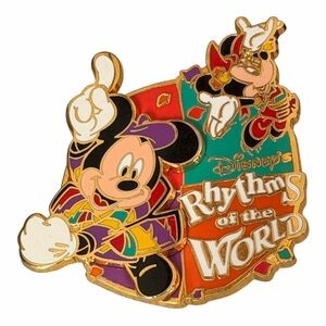 Beautiful Tokyo DisneySea Rhythms of the World Mickey & Minnie pin showcasing colorful hard enamel and gold tone detailing from the beloved DisneySea entertainment show.