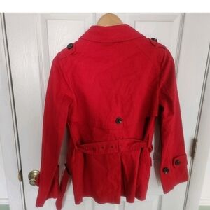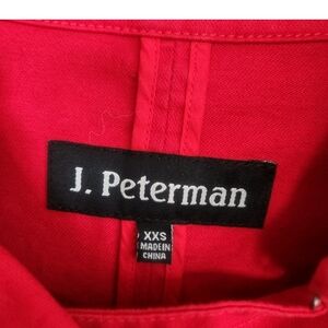 The J. Peterman Women's Size XXS Red Peacoat Raincoat is a stylish and versatile outerwear option perfect for various occasions. Made from cotton with a knit fabric type, this mid-length jacket features a double-breasted closure and belted accents. The classic red color adds a pop of vibrancy to any outfit, while the long sleeves and button closure provide both style and functionality. Ideal for casual, formal, or business settings, this designer pea coat is a timeless piece that can be worn during the summer, fall, or spring seasons. EUC. No callouts