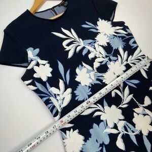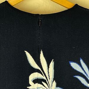 ~ St. John 10 Luxury Knit Midi Dress Navy Floral Cap Sleeve Flounce Hem Jacquard