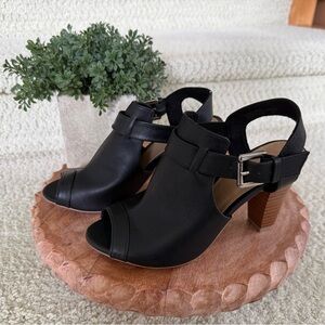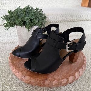Step out in style with these black heeled sandals with buckles on each side. These shoes fits so comfortable! Perfect for any occasion, these shoes offer both comfort and sophistication. All vegan leather. In excellent condition. Never been worn. Size 6.