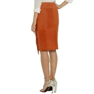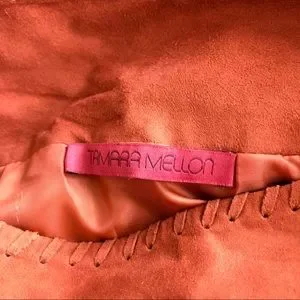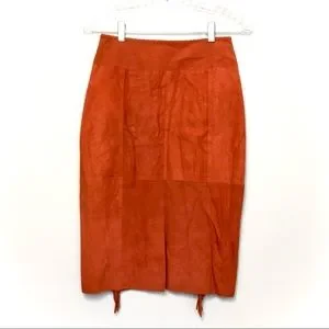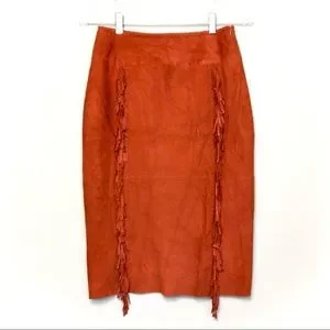 Incredible burnt-orange western suede pencil skirt from cult designer Tamara Mellon. Features buttery soft 100% goat suede leather body with tassel/fringe trim, whipstitched detailing, and sleek pencil silhouette. Made in India. Retailed for $895. Size 2. Approximate measurements: waistband 13”, hips 18”, length 24”. EUC with no flaws.