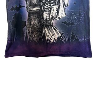 This Halloween skeleton bride and groom with a full moon background in a graveyard tee shirt has such beautiful colors and the graphics are fun and perfect for the fall Halloween season. It has the bride and groom in the front and there is a full moon and graveyard in the back. It is supposed to glow ( I’m guessing the owls eyes and maybe some other parts of the shirt in a black light but I can not guarantee that it does as this is a preloved tee and I don’t not own a black light to test it out ) It’s a great tee all on its own, even without that added feature. It has slight signs of wear but no rips, holes, or tears. It is very soft and is a Juniors Large but may fit a women’s extra small/small so please check the measurements if interested on purchasing. Size Large (11/13) Juniors measurements are PTP 17 1/2” length 26 1/2” cap sleeve 4 3/4”(NF)
