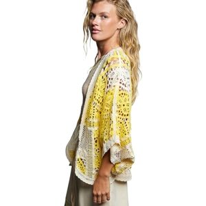 NS04. POL CROCHET BOHEMIAN YELLOW/CREAM CARDIGAN IN ONE SIZE