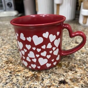 Enjoy your favorite beverage in this charming red mug adorned with white hearts. Perfect for adding a touch of love to your coffee or tea routine.