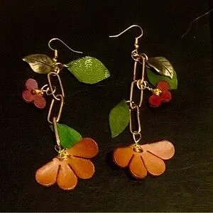 Handcrafted artisan leather earrings featuring leaves and flowers