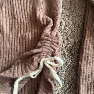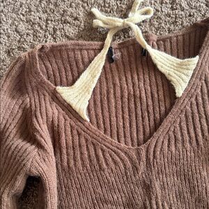 Stylish brown ribbed long sleeve top. Features halter top style tie around neck..all one piece