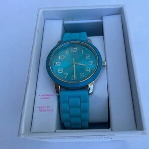 Brand new, with tags, in box, teal, turquoise watch with turquoise face and silver hardware, light up hands, needs new battery.