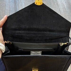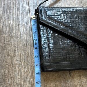 This stylish black crocodile-embossed women's leather bag is perfect for any occasion. Its sleek design and elegant finish make it a must-have accessory. Gently press one of the small buttons on the front latch to open. Great condition and smoke free home