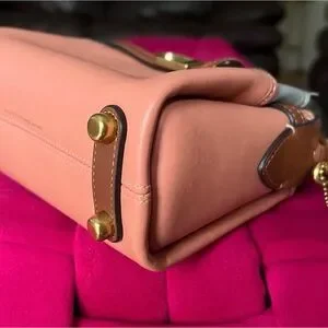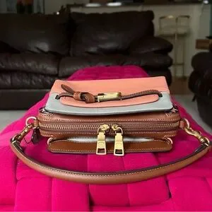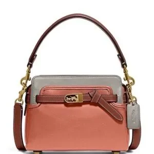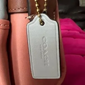 Stylish Coach shoulder bag in coral & gray with brown leather accents and brass toned hardware. Features elegant leather design. Perfect for any occasion. Comes with a crossbody strap & no stains on the inside or any visible callouts that I can see! Feet on the bottom and does fit an iPhone Promax 15!