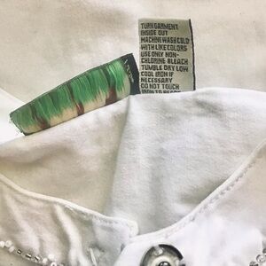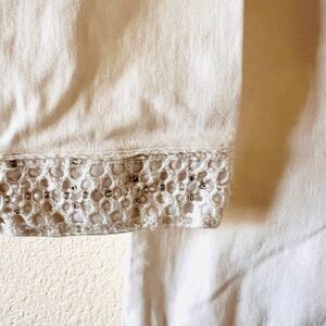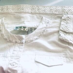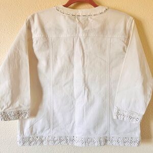 Stylish white button-up jacket featuring delicate lace trim. Perfect for layering.