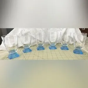 Add a touch of style to your table with this Bormioli glass set featuring a vibrant blue base. Ideal for both casual and formal settings. Please refer to the photos for sizing and condition. This is a beautiful set, the stacked blue square feet on these square cocktail glasses really add a unique flair to your table-scape.