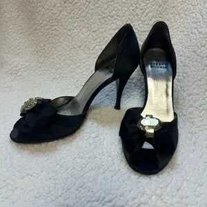 Elegant black heels by Stuart Weitzman. Features a sparkling gem detail on the toe.