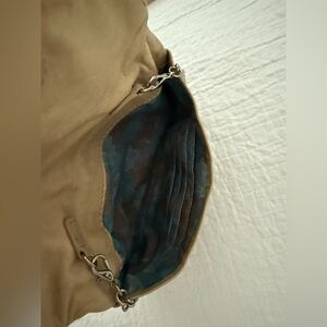 Women’s HOBO Daria, Tan, Leather, Mini, Convertible, Crossbody Bag With Chain Strap, Magnetic Closures, & Multiple Compartments. Chain Tucked In Equals Mini Clutch Bag!