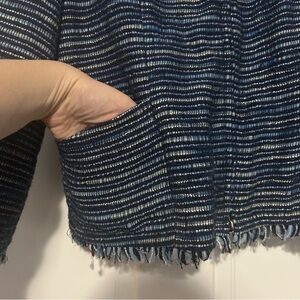 Size 6 blue bouclé knit style zip front blazer from Lafayette 148. Fringe edges with weighted chain hem.