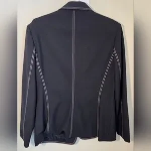 This sophisticated black blazer features stylish white stitching, perfect for a professional look. Ideal for any occasion, it combines elegance with comfort. Length 28" Bust 44" Sleeves 24"