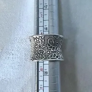 Elevate your jewelry collection with this stunning wide-band silver ring featuring detailed scrollwork and floral motifs that wrap entirely around the band.