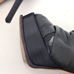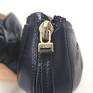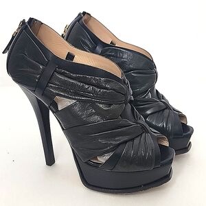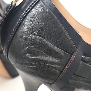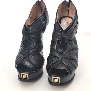 Authentic Fendi high heeled platform bootie, EU 39. Made of soft Olive green and black lambskin leather, accented with a light stacked wood 1" platform and 4" heel, gold metal double F logo on the front of the platform and a back heel zipper. Made in Italy. Gorgeous shoe, preowned, in excellent used condition,