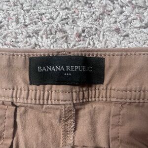 The product is a pair of Banana Republic women's chino shorts in a tan color, featuring a solid pattern, zip closure, and a flat front design. These shorts are designed for a casual occasion and have a mid-rise fit with a classic fit style. The fabric is a blended fabric and they are machine washable. With a waist size of 30 inches and an inseam of 5 inches, these shorts are perfect for the summer, fall, and spring seasons.