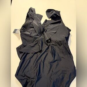 Dive into style with this elegant black ruffled one-piece swimsuit. Perfect for a chic beach look.