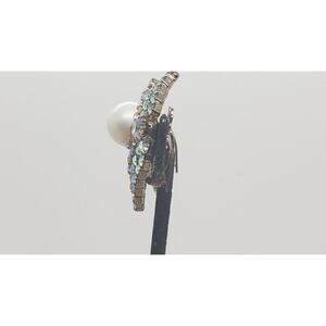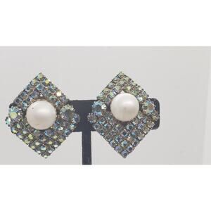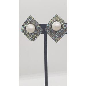 Vintage Aurora Borealis Rhinestone Clip On Earrings Statement Faux Pearl Mid Century