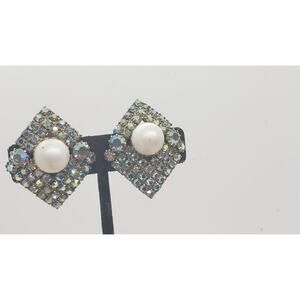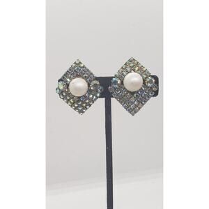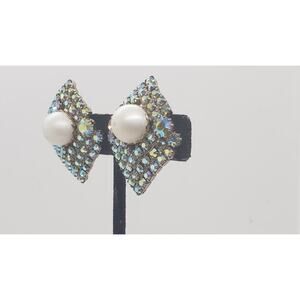 Features a geometric diamond-shaped design covered in sparkling aurora borealis rhinestones. Large round faux pearl cabochon center on each earring for bold statement look. Classic mid-century retro cocktail style, likely 1950s or 1960s era