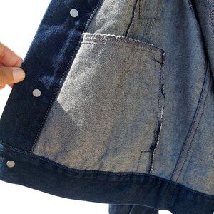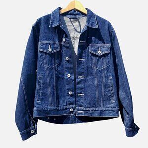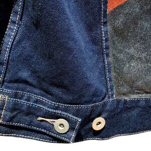 From Goood Jeans (yes, 3 "o's")--probably a European niche designer--here's a fabulous vintage statement jean jacket in indigo denim trucker style with Frida Kahlo's portrait on the back--appears to be hand painted. Fits women L-XL, men M.