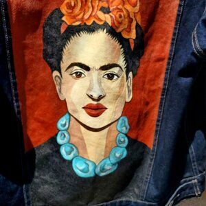 Frida Kahlo Y2K Portrait Denim Trucker Jacket Hand Painted Women L XL / Men M