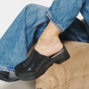 Reformation Reyna platform clogs in black leather with studded trim and black stained wood heel.