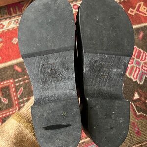 Condition: Gently worn with visible wear to the wood platform and minor rubbing to some rivets from normal wear. Light scuffing to leather. Soles show standard use. Please review photos for details.