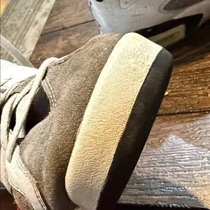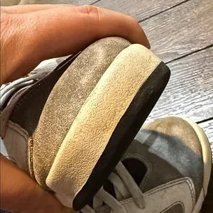 Stylish high-top sneakers in white and gray with black accents. Features a sleek design and comfortable fit.