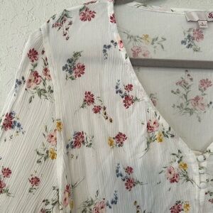 Soft and feminine floral blouse in a lightweight, airy fabric with a romantic cottagecore feel. Features a flattering V-neckline with delicate button details, long sleeves with gentle volume, and a peplum-style hem that creates a flowy, relaxed silhouette. The white base with scattered pink, blue, and yellow florals makes this an easy everyday top for spring and fall.