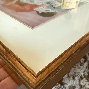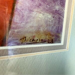 Pre-owned. Frame shows visible corner wear and minor chipping (see close-up photos). Backing paper shows age from previous framing. The artwork displays beautifully when hung.