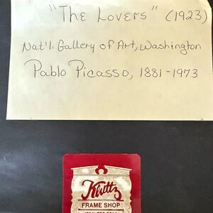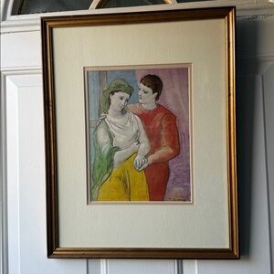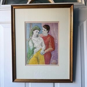 Stunning framed art reproduction of “The Lovers” (1923) by Pablo Picasso, presented with a wide cream mat and rich gold-tone wood frame for a refined, gallery-quality look.