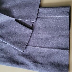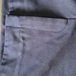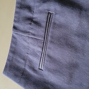 Zip and hook and eye fly closure, dark blue denim look, but sleek.