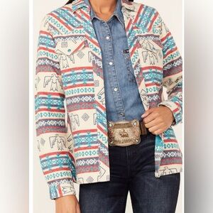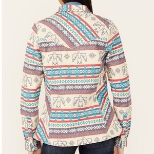 For a shirt that embodies the rugged elegance of the West, look no further than the Outback Trading Co Women's Lorelei Southwestern Thunderbird Print Long Sleeve Snap Performance Shirt.